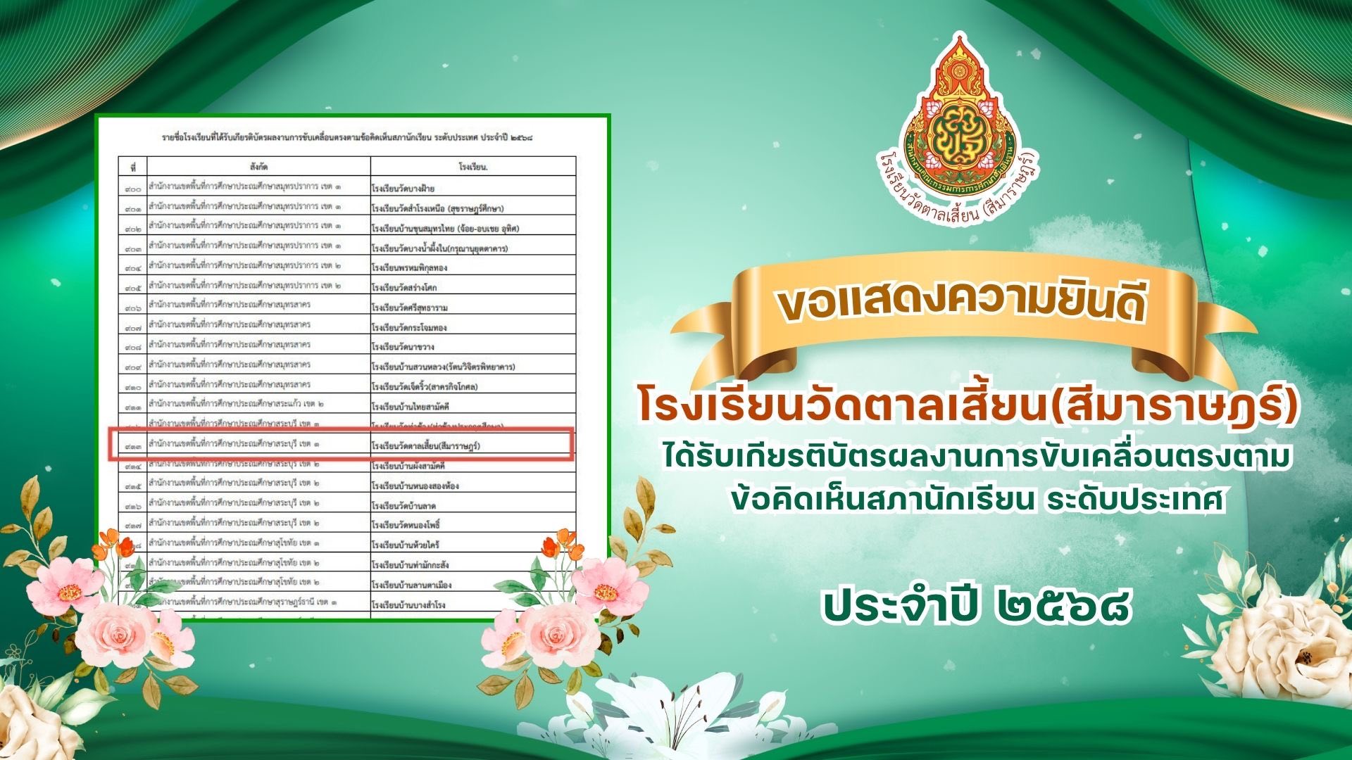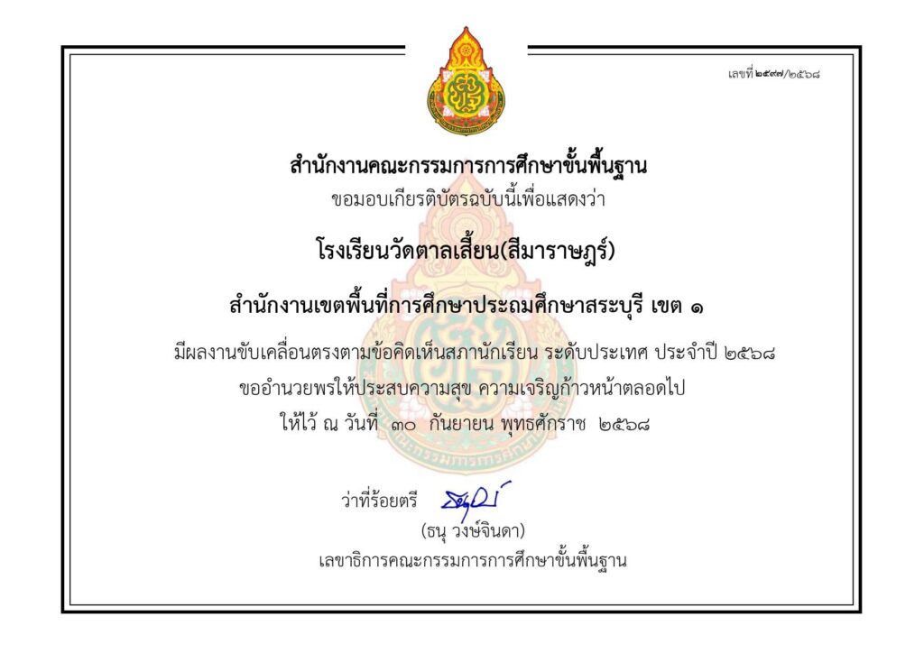 โรงเรียนวัดตาลเสี้ยน(สีมาราษฎร์)ได้รับเกียรติบัตรผลงานการขับเคลื่อนตรงตามข้อคิดเห็นสภานักเรียน ระดับประเทศ ประจำปี 2568 ![]()