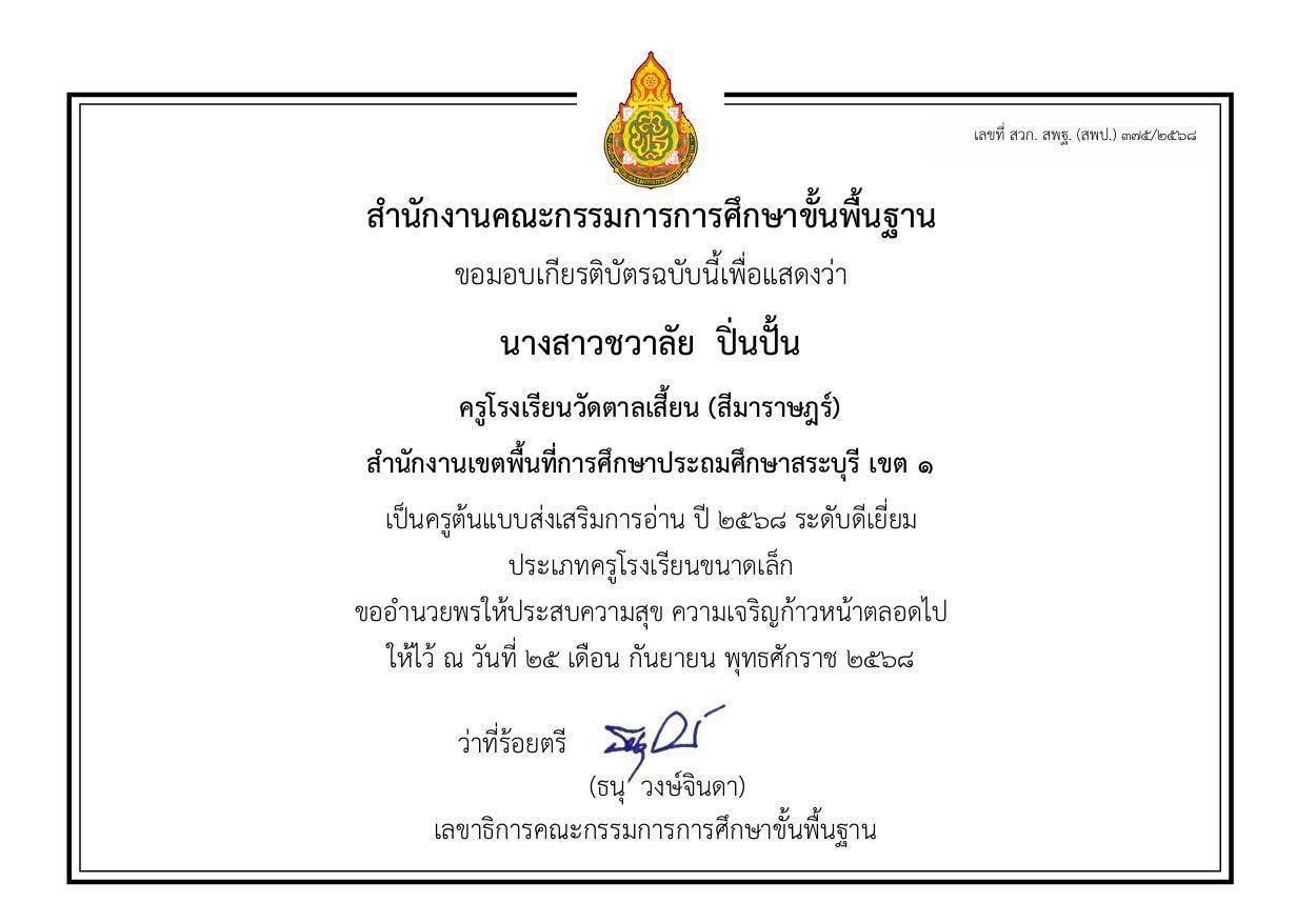 โรงเรียนวัดตาลเสี้ยน(สีมาราษฎร์) ขอแสดงความยินดี เนื่องด้วยประกาศสำนักงานคณะกรรมการการศึกษาขั้นพื้นฐาน เรื่อง ผลการคัดเลือกครูต้นแบบส่งเสริมการอ่าน ปี 2568 ระดับดีเยี่ยม สังกัดสำนักงานคณะกรรมการการศึกษาขั้นพื้นฐาน เพื่อยกย่องเชิดชูเกียรติ ครูที่ปฏิบัติงานด้านการส่งเสริมการอ่านเป็นที่ประจักษ์